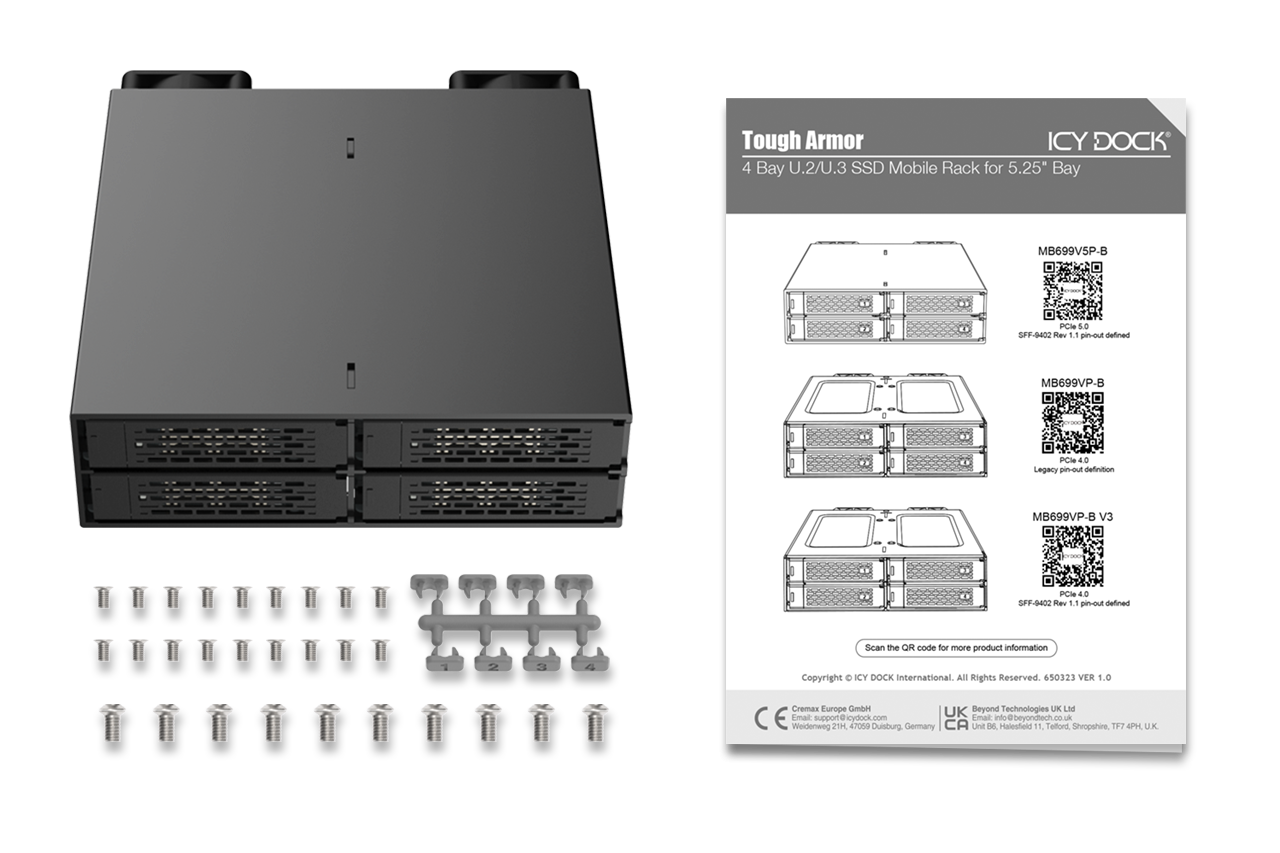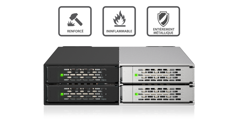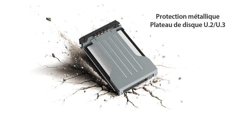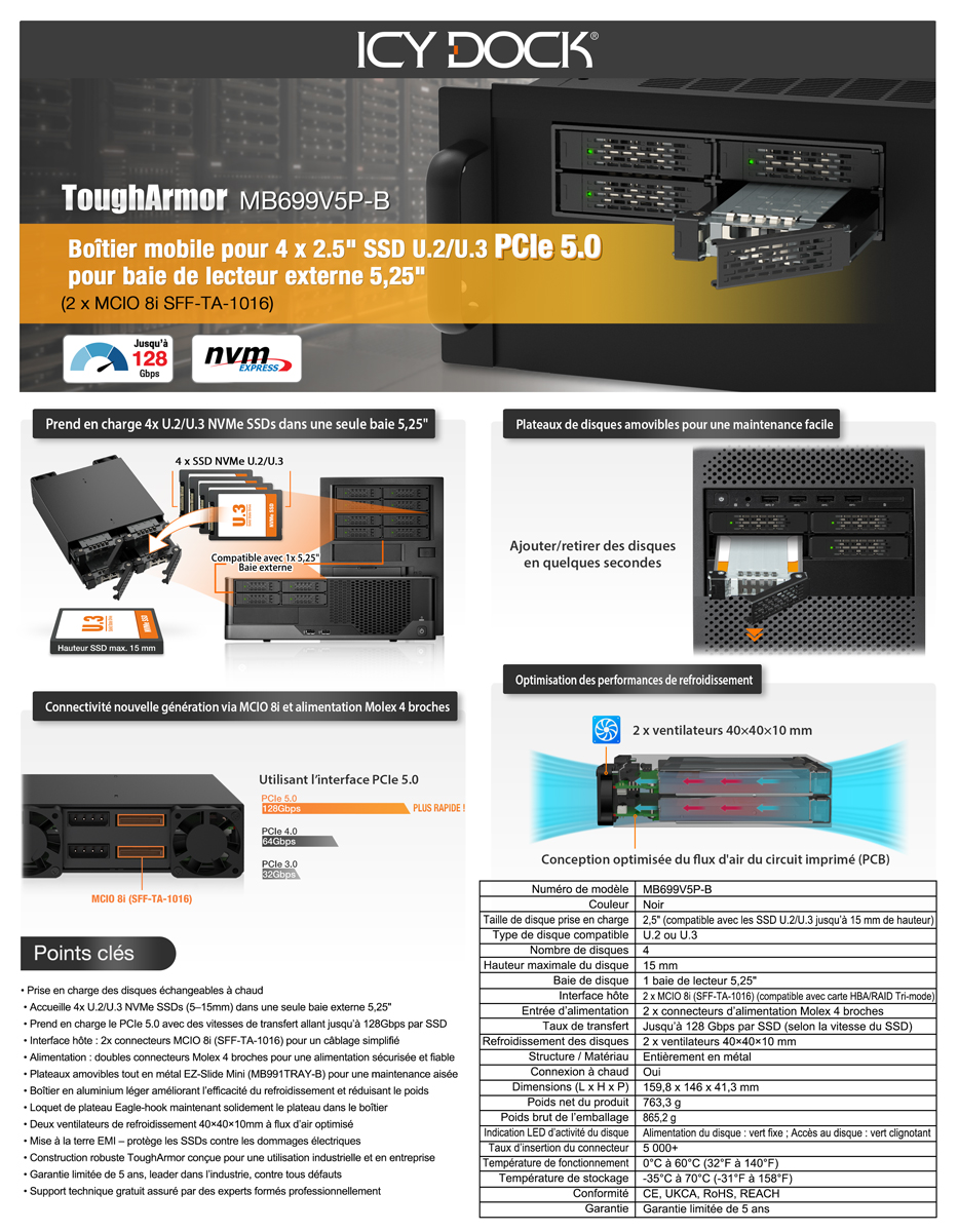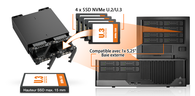 • | Accueille 4× SSD NVMe U.2/U.3 (5 – 15 mm) dans une seule baie 5.25" externe |