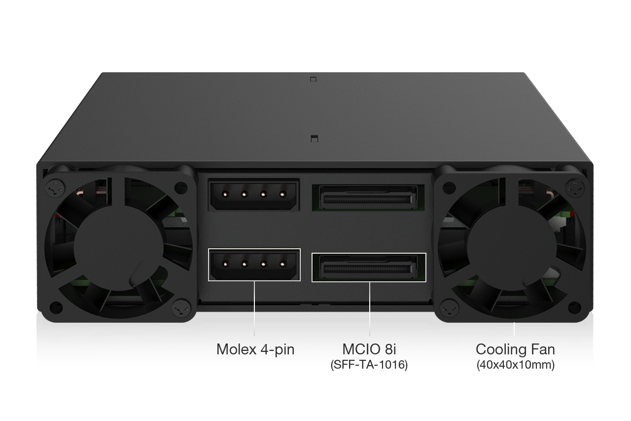 Interface de l'hôte : | 2 x MCIO 8i (SFF-TA-1016), brochage défini par SFF-9402 Rev 1.1 (Compatible avec les cartes HBA/RAID Tri-mode) |