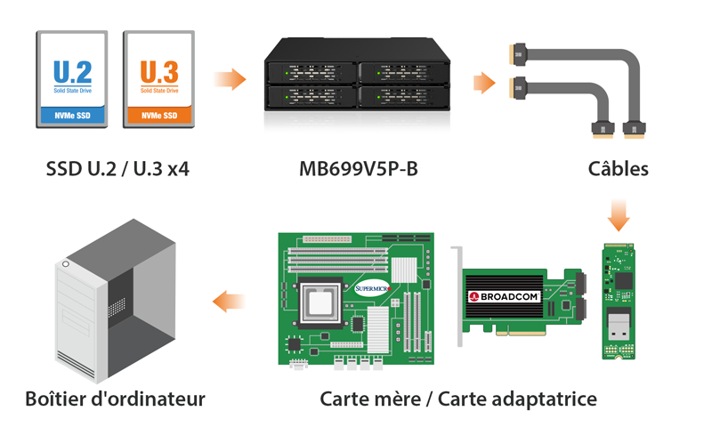 R : Pour garantir la compatibilité avec le MB699V5P-B, veuillez vous assurer que le BIOS/UEFI de votre carte d’extension ou de votre carte mère prend en charge la bifurcation PCIe lors de l’utilisation d’un slot PCIe 16x ou 8x. De plus, configurez le répartiteur PCIe dans le BIOS/UEFI avec la configuration x4, x4, x4, x4 pour un slot PCIe 16x ou x4, x4 pour un slot PCIe 8x.
