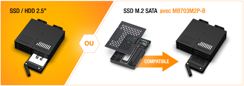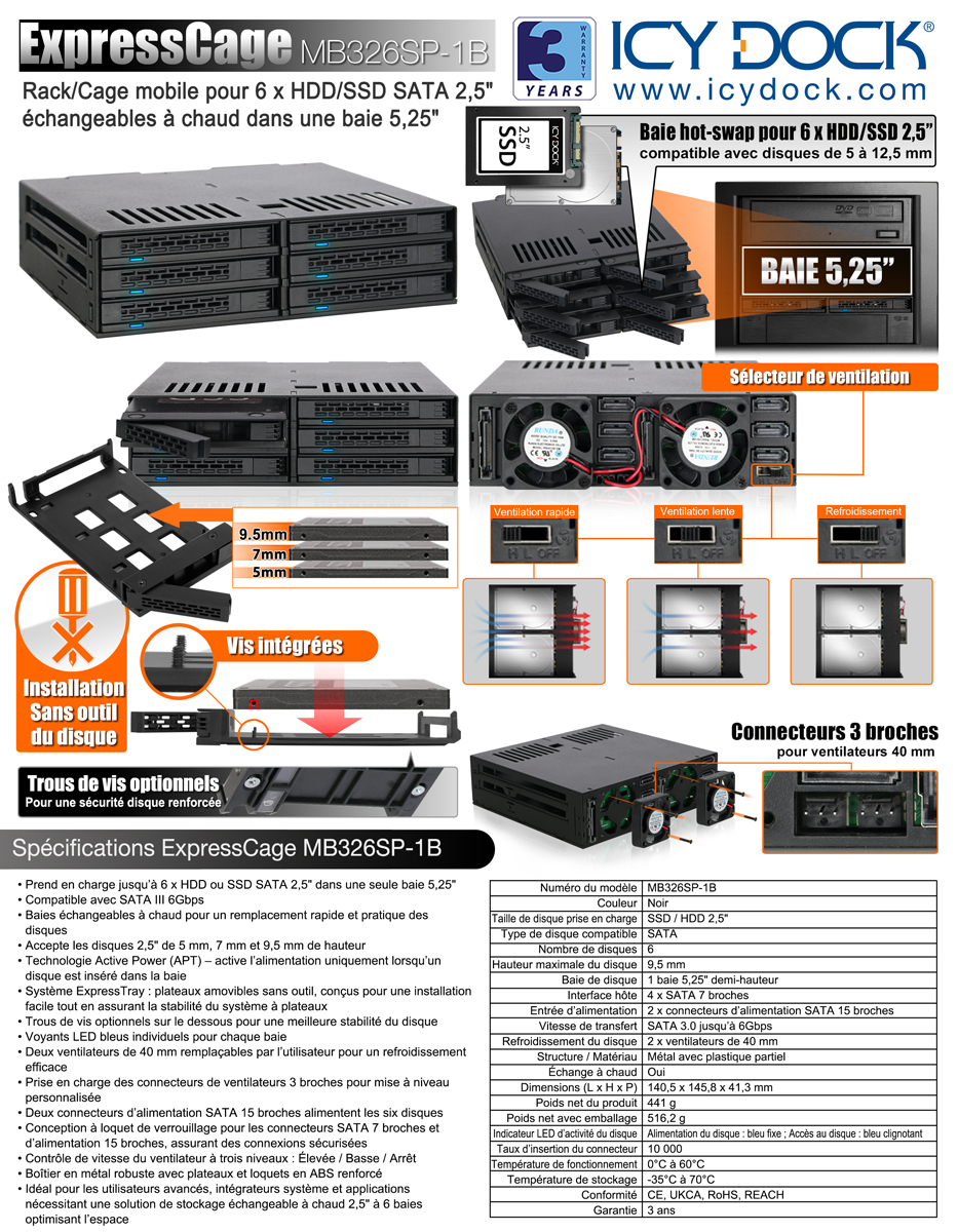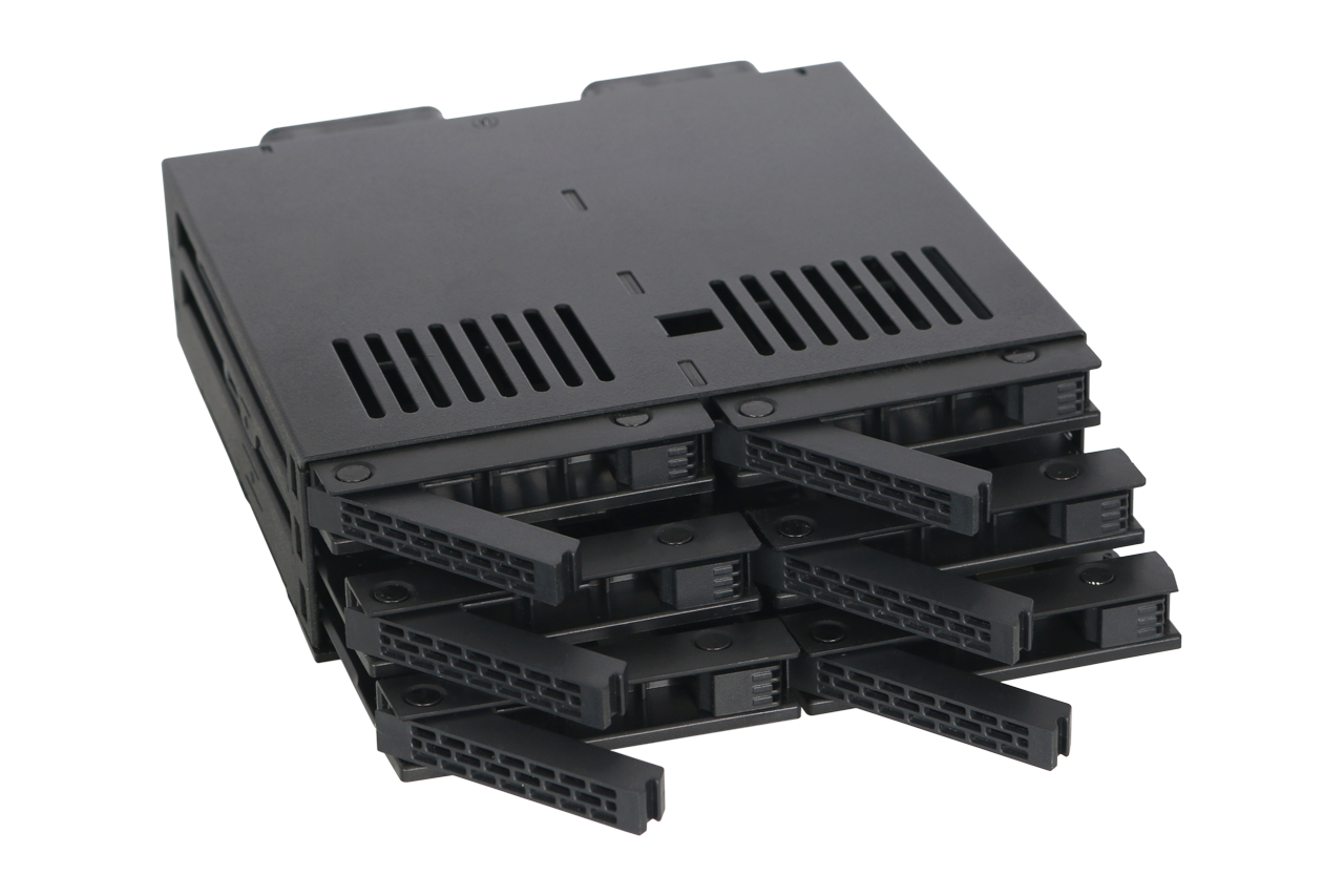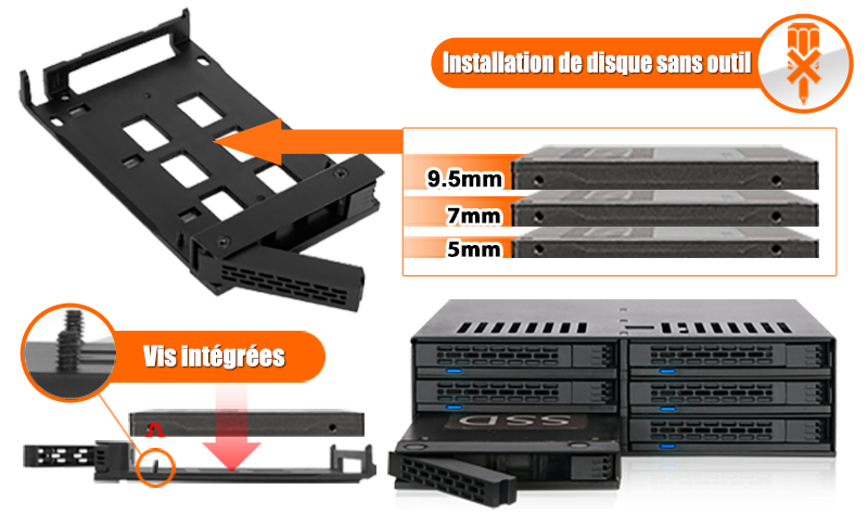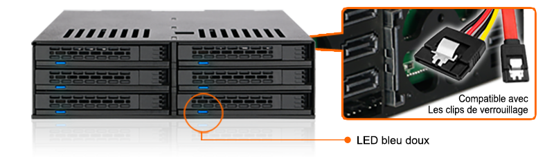 | • | Prend en charge jusqu'à 6 disques SATA HDD ou SSD 2.5" dans une seule baie 5.25" |