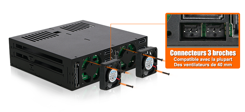 | • | Deux ventilateurs de 40 mm remplaçables par l’utilisateur pour un refroidissement efficace des disques |
