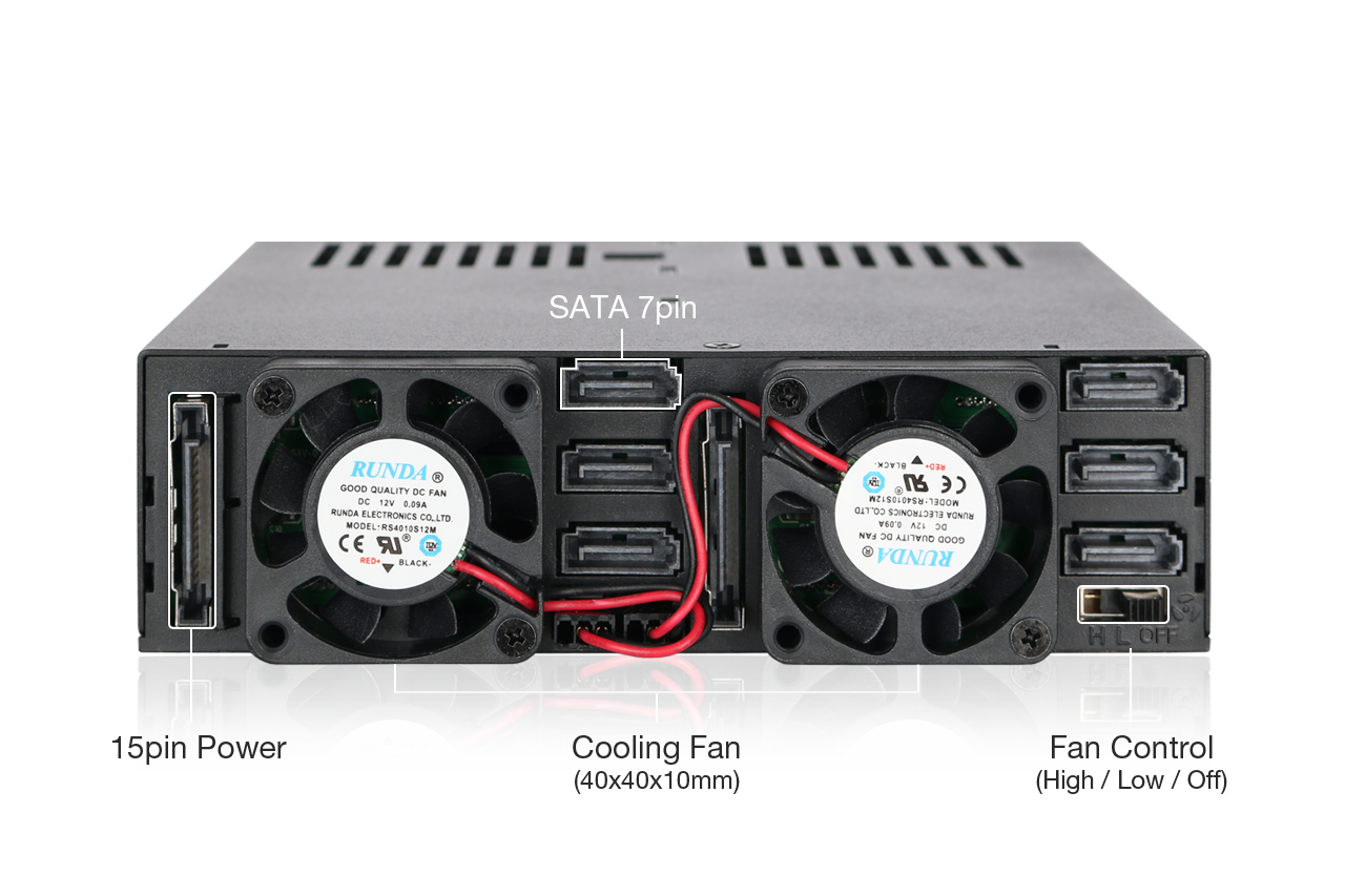 Pour répondre aux exigences thermiques de six disques, le MB326SP-1B est équipé de deux ventilateurs de refroidissement de 40 mm montés à l’arrière, soutenus par des trous de ventilation autour du châssis et des tiroirs. Les utilisateurs peuvent choisir entre trois modes de ventilation à l’aide d’un interrupteur à glissière :