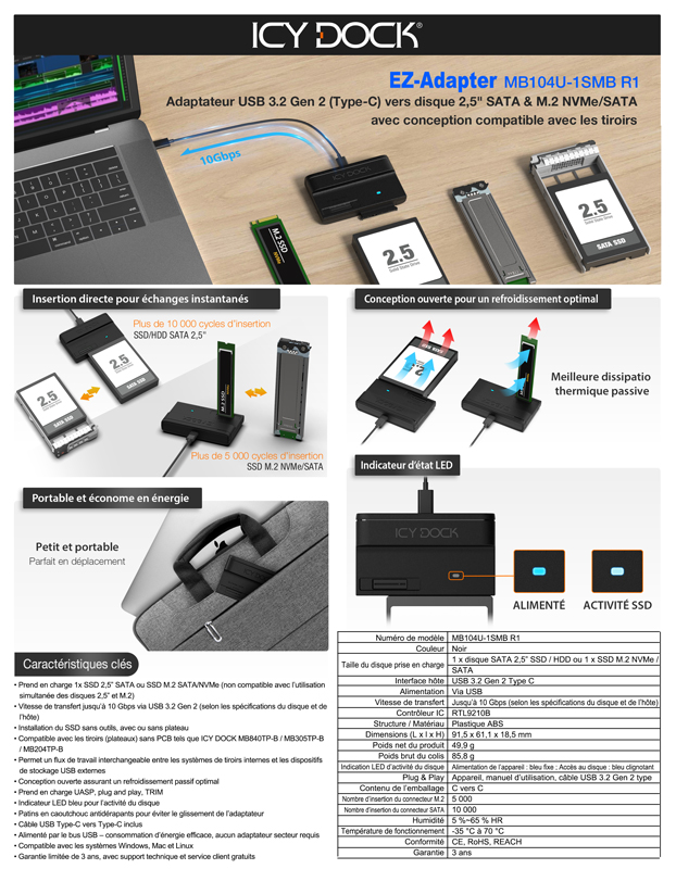 | • | Vitesses de transfert jusqu’à 10Gbps via USB 3.2 Gen 2 (selon les spécifications du disque et de l’hôte) |