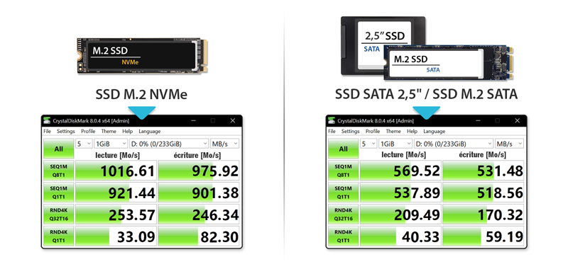 • SSD/HDD SATA 2.5" • Tiroirs SSD/HDD SATA 2.5" • SSD M.2 NVMe/SATA |