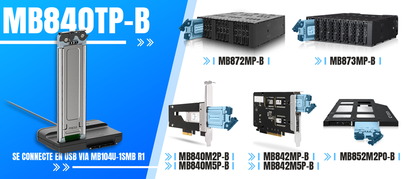 | • | Prise en charge de la connexion directe des tiroirs tels que ICY DOCK MB840TP-B / MB305TP-B / MB204TP-B et autres tiroirs standards sans PCB |