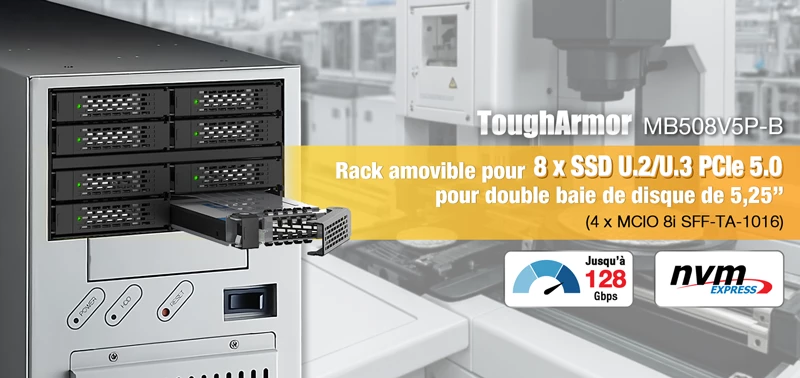 | • | Compatible avec 8 SSD NVMe U.2/U.3 de 15 mm dans 2 baies de disque de 5,25" |