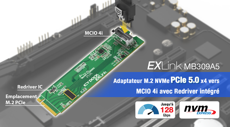 Le MB309A5 est un élément clé de l’écosystème EXLink d’ICY DOCK, conçu pour simplifier le déploiement de solutions SSD NVMe amovibles. Que vous mettiez à niveau un seul emplacement M.2, construisiez une configuration U.2 avec accès en façade ou étendiez la capacité à deux disques, le MB309A5 fonctionne parfaitement avec les racks amovibles et les câbles MCIO d’ICY DOCK pour offrir une solution clé en main.