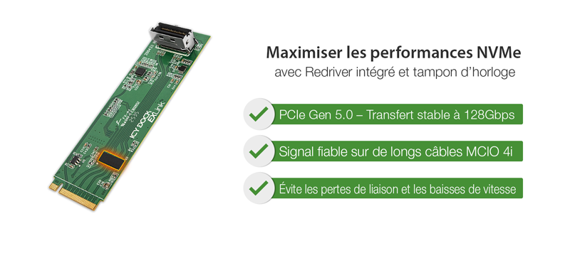 | • | Convertit un emplacement NVMe M.2 (PCIe Gen5 x4) en une sortie MCIO 4i |