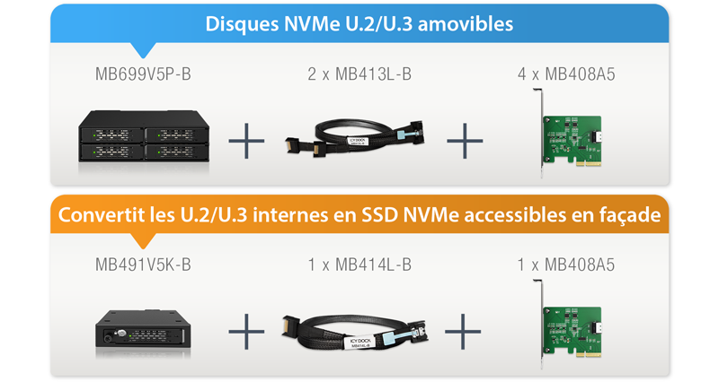 | • | Compatibilité validée avec les racks mobiles NVMe et câbles ICY DOCK |