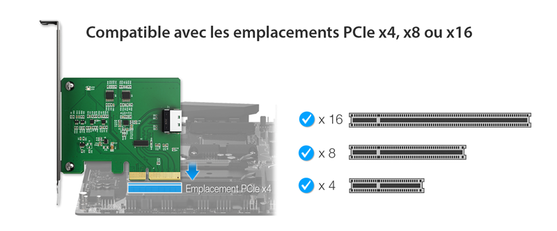 | Emplacements pris en charge: | Fonctionne avec les emplacements PCIe 2.0/3.0/4.0 ou 5.0 x4/x8/x16 sur les cartes mères |