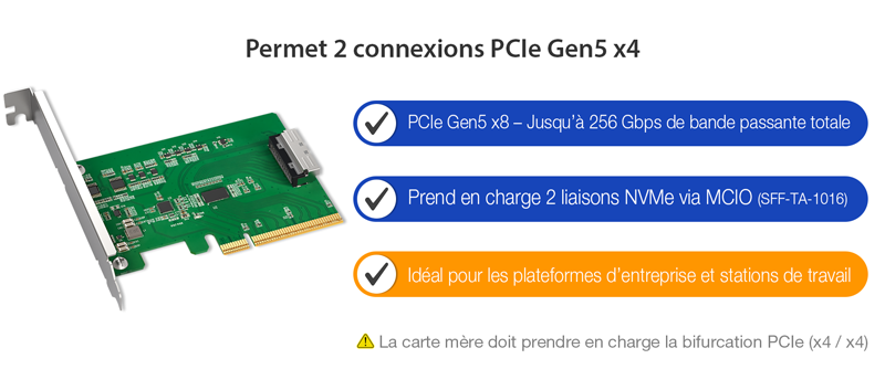 | • | Nécessite la bifurcation PCIe de la carte mère (x4, x4) pour accéder à deux SSD (Cette carte adaptateur n’effectue pas elle-même la bifurcation) |