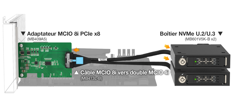 Conseil clé : La disponibilité des voies PCIe dépend des spécifications de votre carte mère et de votre CPU, ainsi que du nombre de SSD PCIe et d’autres périphériques installés. Par conséquent, nous ne pouvons pas garantir la compatibilité avec le MB409A5 uniquement sur la base d’une liste de compatibilité. Nous vous recommandons fortement de consulter le fournisseur de votre carte mère afin de confirmer le nombre de voies PCIe disponibles dans votre système et si les emplacements PCIe vides restants peuvent pleinement prendre en charge le MB409A5 avec deux SSD NVMe.