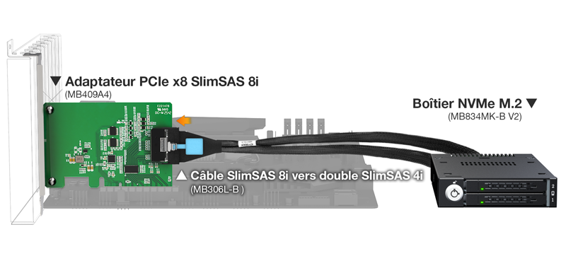 Conseil clé : La disponibilité des voies PCIe dépend des spécifications de votre carte mère et de votre CPU, ainsi que du nombre de SSD PCIe et d’autres périphériques installés. Par conséquent, nous ne pouvons pas garantir la compatibilité avec le MB409A4 uniquement sur la base d’une liste de compatibilité. Nous vous recommandons fortement de consulter le fournisseur de votre carte mère afin de confirmer le nombre de voies PCIe disponibles dans votre système et si les emplacements PCIe vides restants peuvent pleinement prendre en charge le MB409A4 avec deux SSD NVMe.