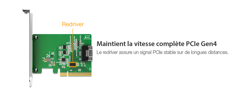 | • | Redriver PCIe Gen4 intégré pour une meilleure intégrité du signal sur des pistes et câbles étendus |